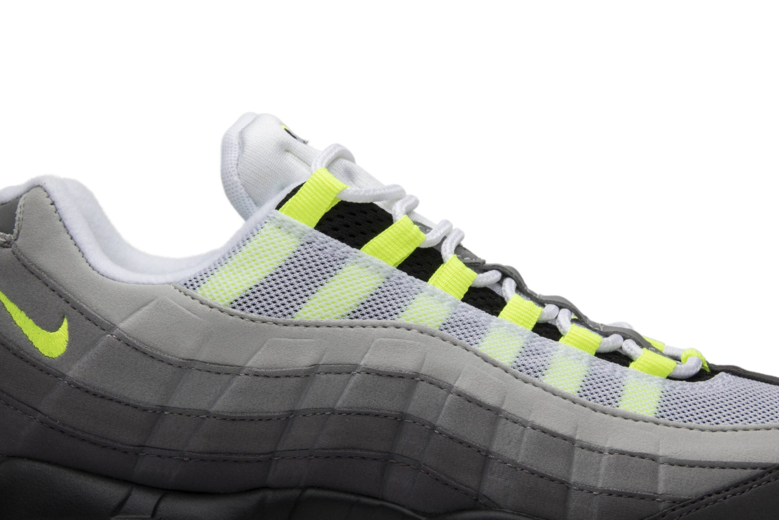 - Design: Iconic Air Max 95 silhouette with its signature layered design, featuring a gradient color scheme in neon yellow, grey, and black.